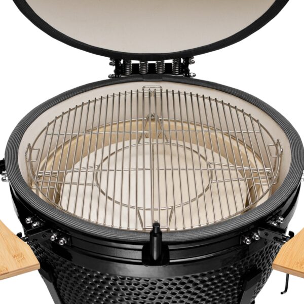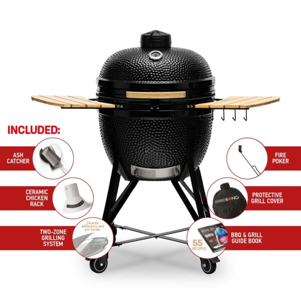 Kamado Bono is a 3-in-1 outdoor grill, oven and smoker. It is the largest Kamado Bono grill with an extra large cooking area. It is perfect for a backyard, a patio, a holiday home or a catering establishment. For a natural person, all ceramic parts come with an unlimited warranty.