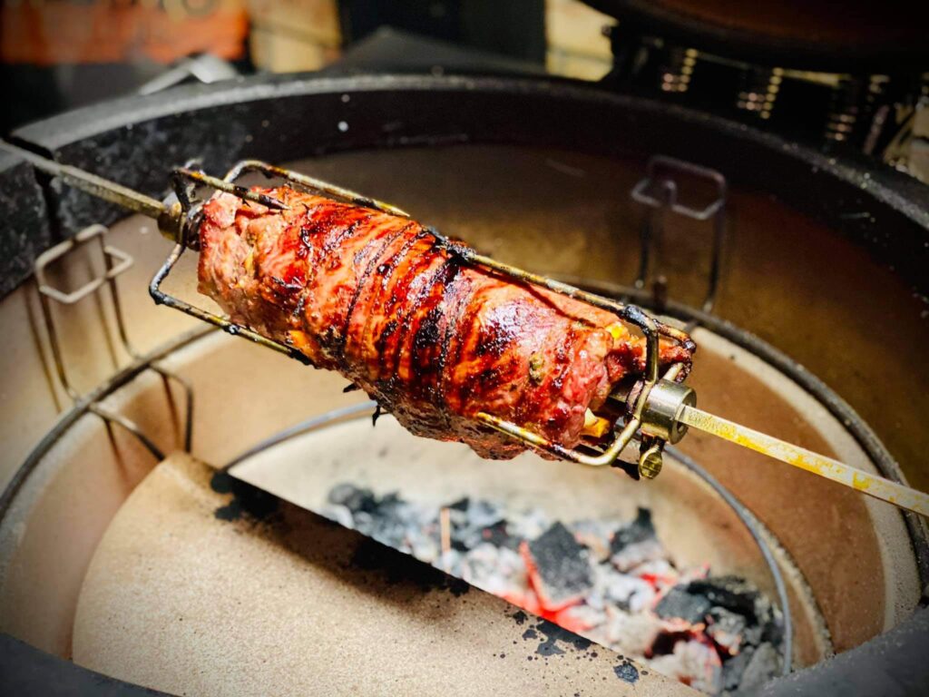 4. Place the meat on the rotisserie mechanism and cook for about 40 minutes until the internal temperature reaches 50°C.