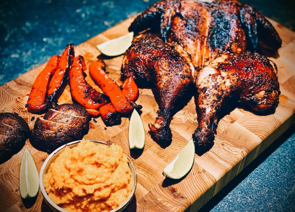 - Set up the cooking system with deflector plates and place the cooking grate on top. Cook the chicken for about 1.5 hours, basting regularly with the reserved marinade.