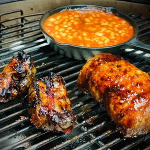 - Prepare the Kamado BONO grill for indirect cooking: light the charcoal, place the two-zone system with deflectors, and set a pan for collecting fat on top of the deflector. Add a few smoking wood chunks to the charcoal, place the stainless steel grill grates on top, and wait until the temperature reaches 180°C. Adjust the top and bottom air vents to maintain an even temperature. Cook the meat for about 50 minutes, skin-side down, until it turns a nice colour.