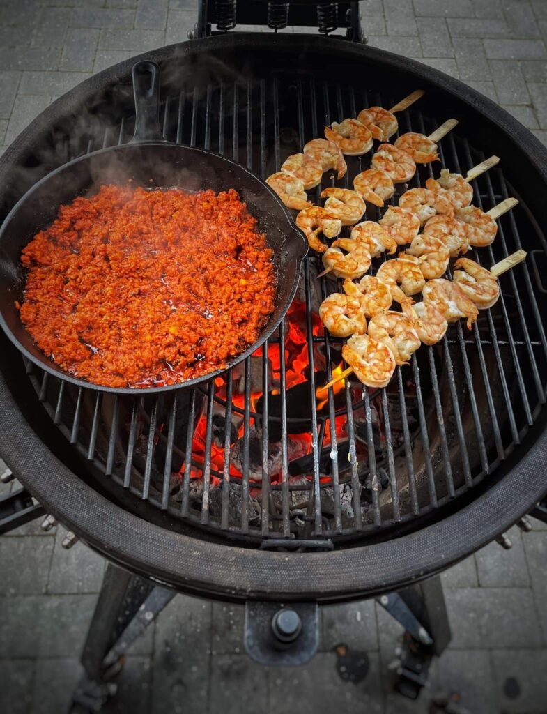 - Remove the chorizo sausages from their casing, finely chop the garlic cloves and onion. Prepare your Kamado BONO grill for direct grilling, light the charcoal, place the grill grates on top, and wait for the temperature to reach 180°C. Adjust the top and bottom air vents to maintain an even temperature.